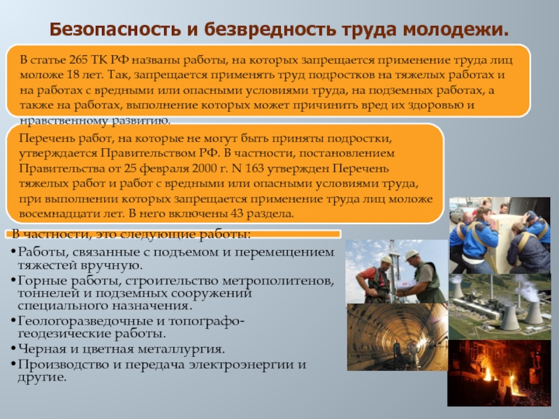 на которых запрещается применение труда лиц моложе 18 лет. Так, запрещается применять труд подростков на тяжелых работах и на работах с вредными или опасными условиями труда, на подземных работах, а также на работах, выполнение которых может причинить вред их здоровью и нравственному развитию.