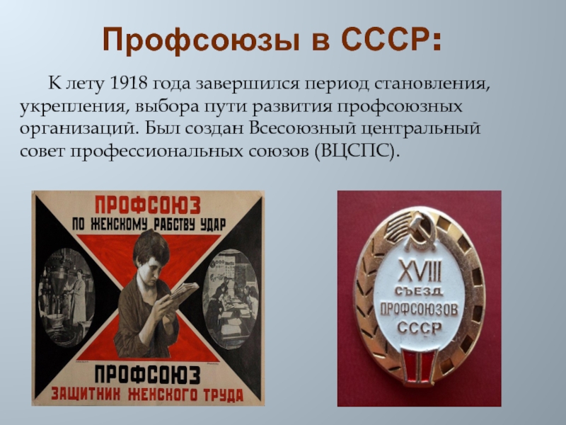 становления, укрепления, выбора пути развития профсоюзных организаций. Был создан Всесоюзный центральный совет профессиональных союзов (ВЦСПС).
