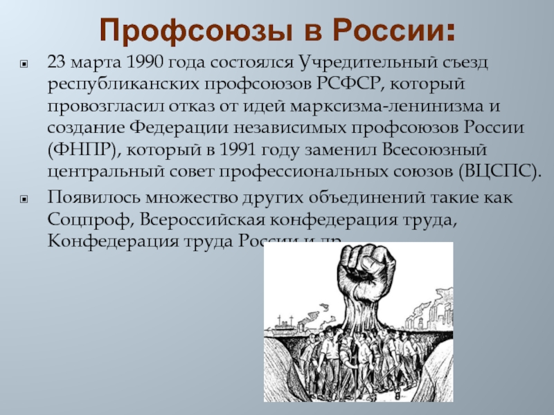 РСФСР, который провозгласил отказ от идей марксизма-ленинизма и создание Федерации независимых профсоюзов России (ФНПР), который в 1991 году заменил Всесоюзный центральный совет профессиональных союзов (ВЦСПС).