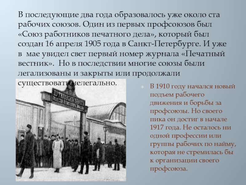 В последующие два года образовалось уже около ста рабочих союзов. Один из первых профсоюзов был «Союз работников печатного дела», который был создан 16 апреля 1905 года в Санкт-Петербурге. И уже в мае увидел свет первый номер журнала «Печатный вестник». Но в последствии многие союзы были легализованы и закрыты или продолжали существовать нелегально.