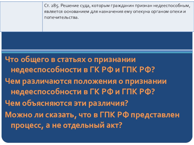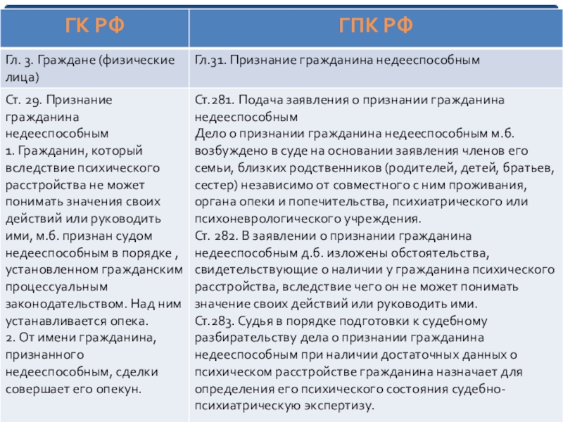 Слайд 8Что общего в статьях о признании недееспособности в ГК РФ и