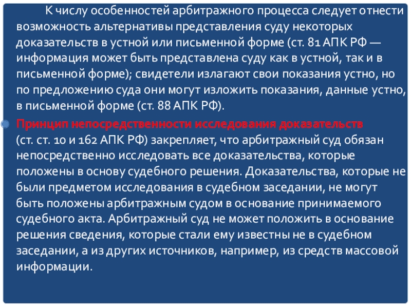 Принцип непосредственности исследования доказательств (ст. ст. 10 и 162 АПК РФ) закрепляет, что арбитражный суд обязан непосредственно исследовать все доказательства, которые положены в основу судебного решения. Доказательства, которые не были предметом исследования в судебном заседании, не могут быть положены арбитражным судом в основание принимаемого судебного акта. Арбитражный суд не может положить в основание решения сведения, которые стали ему известны не в судебном заседании, а из других источников, например, из средств массовой информации.