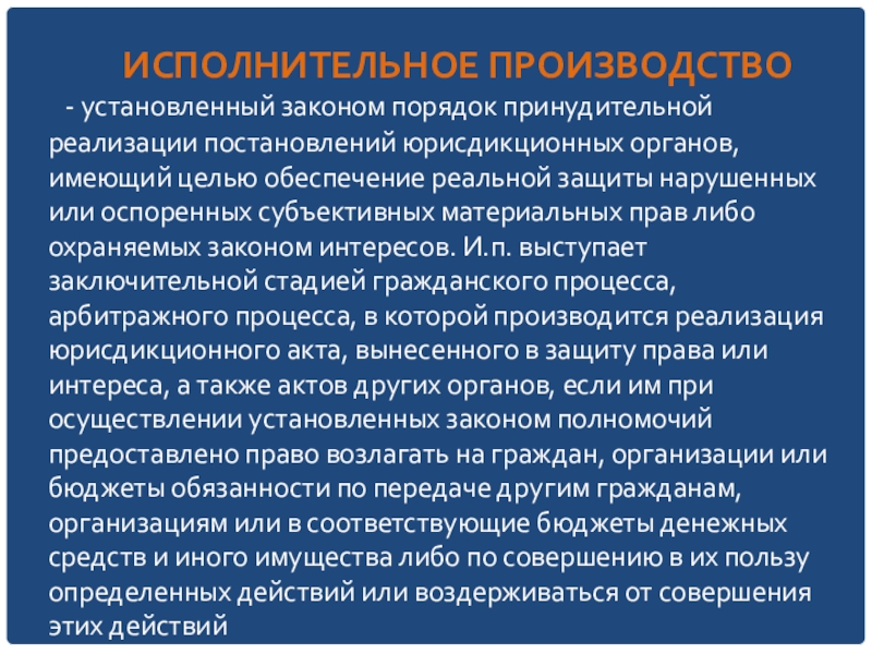 целью обеспечение реальной защиты нарушенных или оспоренных субъективных материальных прав либо охраняемых законом интересов. И.п. выступает заключительной стадией гражданского процесса, арбитражного процесса, в которой производится реализация юрисдикционного акта, вынесенного в защиту права или интереса, а также актов других органов, если им при осуществлении установленных законом полномочий предоставлено право возлагать на граждан, организации или бюджеты обязанности по передаче другим гражданам, организациям или в соответствующие бюджеты денежных средств и иного имущества либо по совершению в их пользу определенных действий или воздерживаться от совершения этих действий