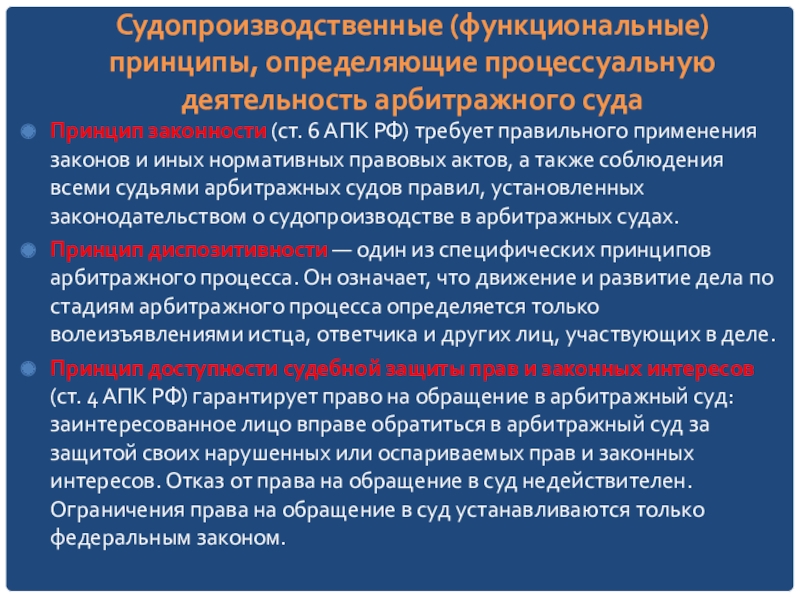 Слайд 25Судопроизводственные (функциональные) принципы, определяющие процессуальную деятельность арбитражного суда