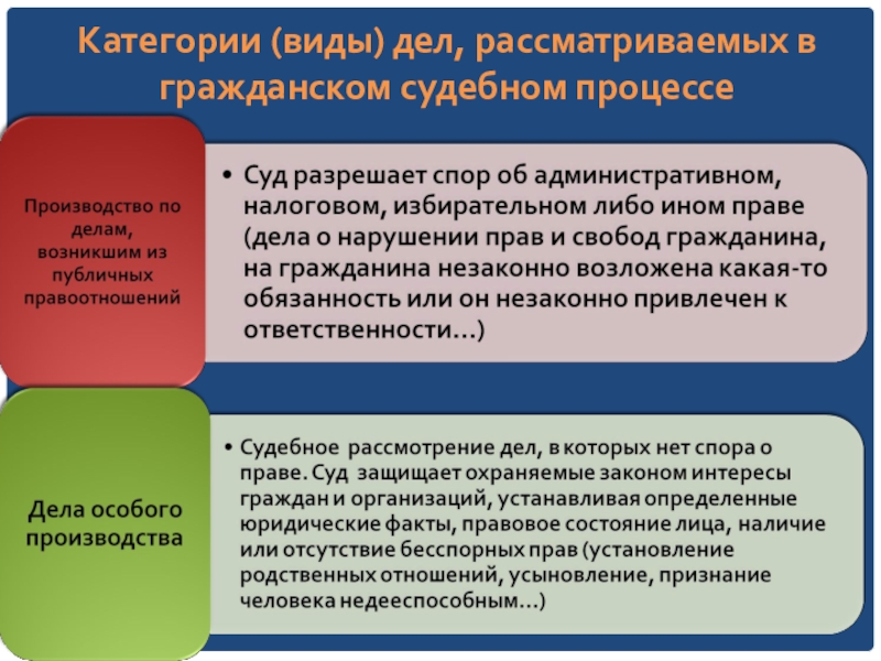Слайд 10Категории (виды) дел, рассматриваемых в гражданском судебном процессе
