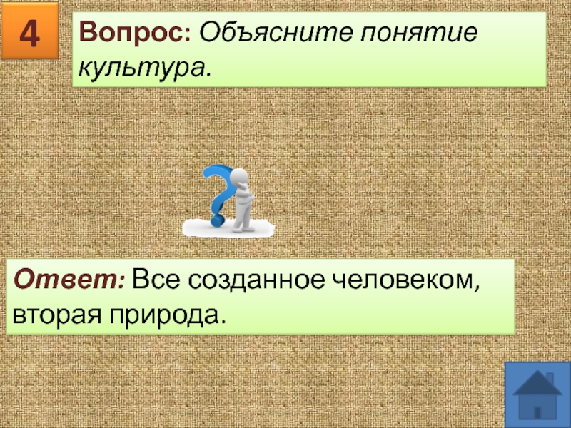 Вопрос: Объясните понятие культура. 4Ответ: Все созданное человеком, вторая природа.