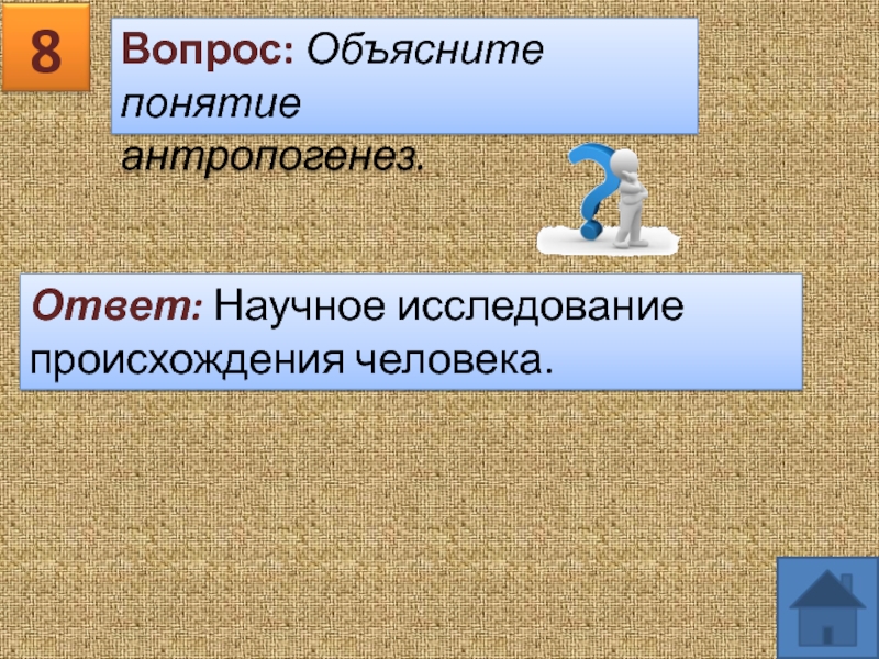 Вопрос: Объясните понятие антропогенез.8Ответ: Научное исследование происхождения человека.