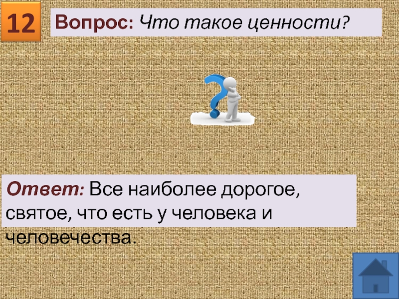 Вопрос: Что такое ценности?12Ответ: Все наиболее дорогое, святое, что есть у человека и человечества.