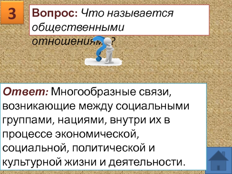 Вопрос: Что называется общественными отношениями?3Ответ: Многообразные связи, возникающие между социальными группами, нациями, внутри их в процессе экономической,