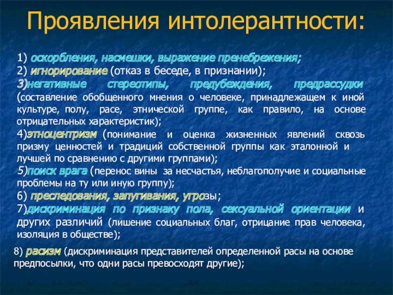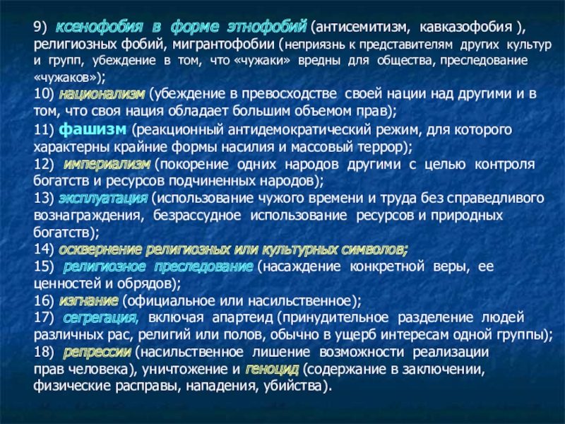 8) расизм (дискриминация представителей определенной расы на основе предпосылки, что одни расы превосходят другие);