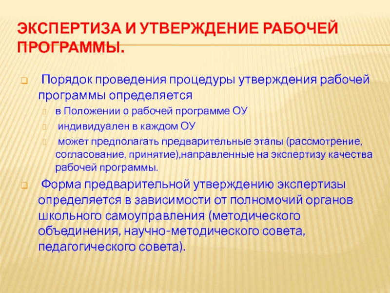 может предполагать предварительные этапы (рассмотрение, согласование, принятие),направленные на экспертизу качества рабочей программы.