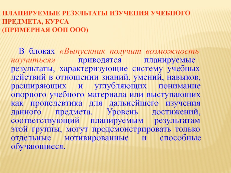 В блоках «Выпускник получит возможность научиться» приводятся планируемые результаты, характеризующие систему учебных действий в отношении знаний, умений, навыков, расширяющих и углубляющих понимание опорного учебного материала или выступающих как пропедевтика для дальнейшего изучения данного предмета. Уровень достижений, соответствующий планируемым результатам этой группы, могут продемонстрировать только отдельные мотивированные и способные обучающиеся.