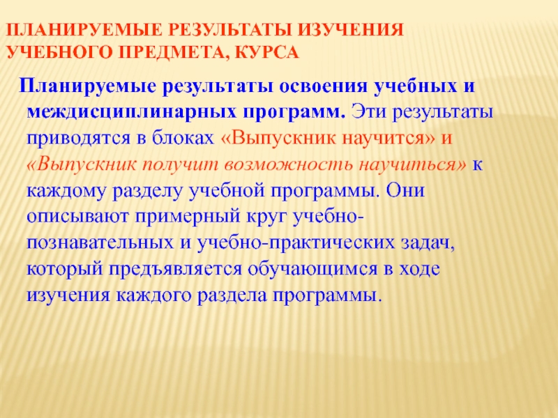 и междисциплинарных программ. Эти результаты приводятся в блоках «Выпускник научится» и «Выпускник получит возможность научиться» к каждому разделу учебной программы. Они описывают примерный круг учебно-познавательных и учебно-практических задач, который предъявляется обучающимся в ходе изучения каждого раздела программы.