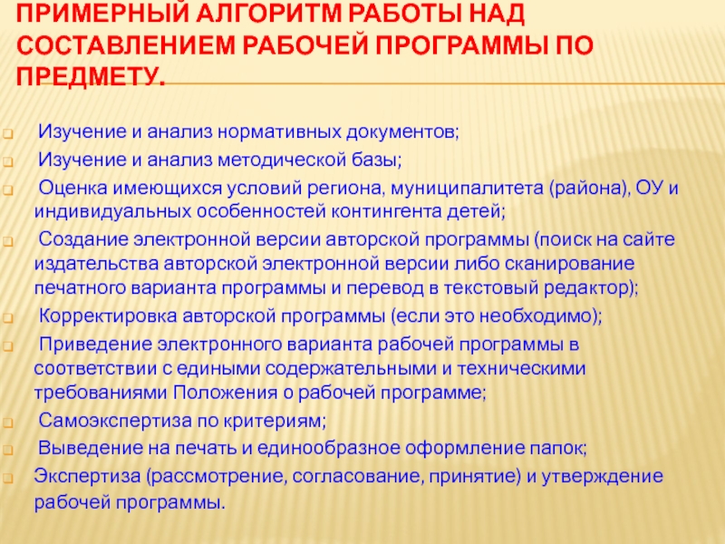 Слайд 28Примерный алгоритм работы над составлением рабочей программы по предмету.