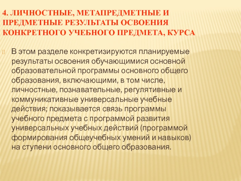 этом разделе конкретизируются планируемые результаты освоения обучающимися основной образовательной программы основного общего образования, включающими, в том числе, личностные, познавательные, регулятивные и коммуникативные универсальные учебные действия; показывается связь программы учебного предмета с программой развития универсальных учебных действий (программой формирования общеучебных умений и навыков) на ступени основного общего образования.