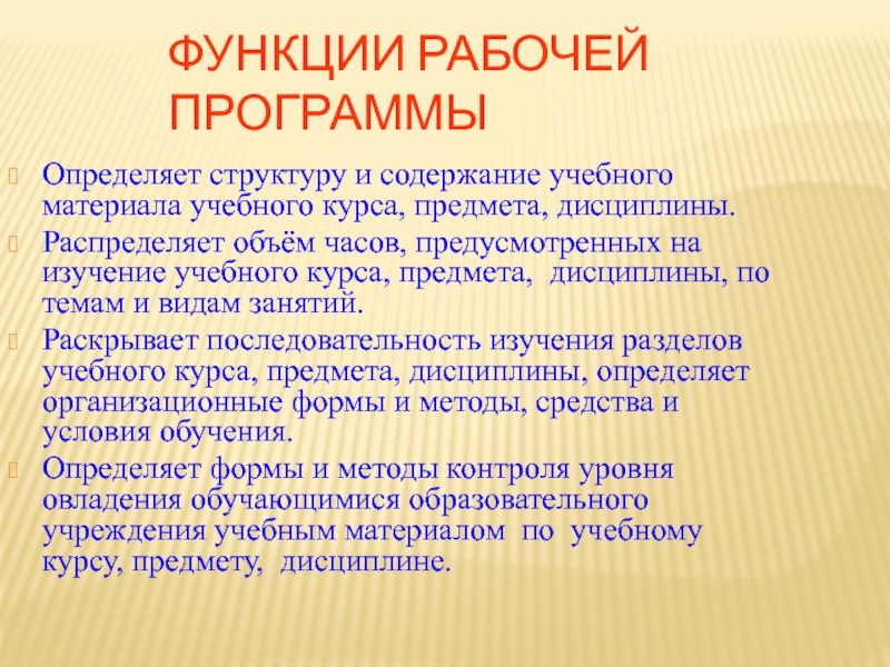 Раскрывает последовательность изучения разделов учебного курса, предмета, дисциплины, определяет организационные формы и методы, средства и условия обучения.