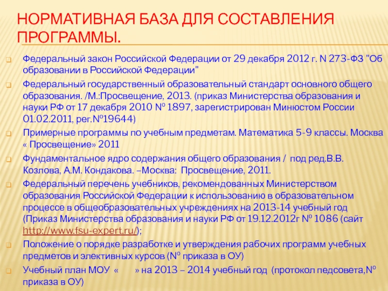 Федеральный перечень учебников, рекомендованных Министерством образования Российской Федерации к использованию в образовательном процессе в общеобразовательных учреждениях на 2013-14 учебный год (Приказ Министерства образования и науки РФ от 19.12.2012г № 1086 (сайт http://www.fsu-expert.ru/);