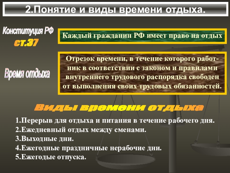 2.Понятие и виды времени отдыха.Конституция РФ Каждый гражданин РФ имеет право на отдыхст.37 Время отдыха Отрезок времени,