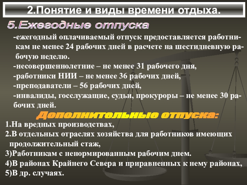 2.Понятие и виды времени отдыха.5.Ежегодные отпуска -ежегодный оплачиваемый отпуск предоставляется работни- кам не менее 24 рабочих дней
