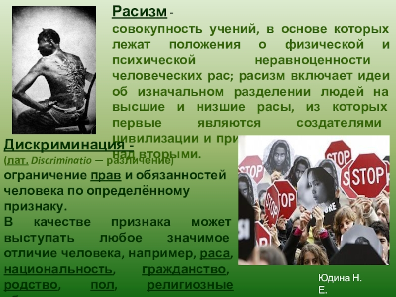 В качестве признака может выступать любое значимое отличие человека, например, раса, национальность, гражданство, родство, пол, религиозные убеждения, возраст, инвалидность, род занятий и т.д.