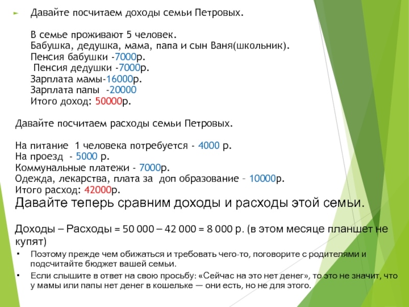 Слайд 12Давайте посчитаем доходы семьи Петровых. В семье проживают 5 человек. Бабушка, дедушка, мама,