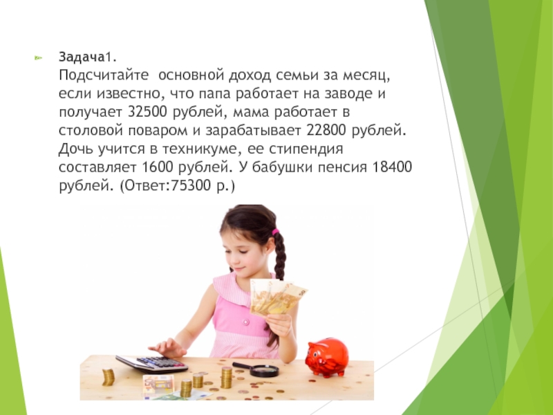 Подсчитайте основной доход семьи за месяц, если известно, что папа работает на заводе и получает 32500 рублей, мама работает в столовой поваром и зарабатывает 22800 рублей. Дочь учится в техникуме, ее стипендия составляет 1600 рублей. У бабушки пенсия 18400 рублей. (Ответ:75300 р.)