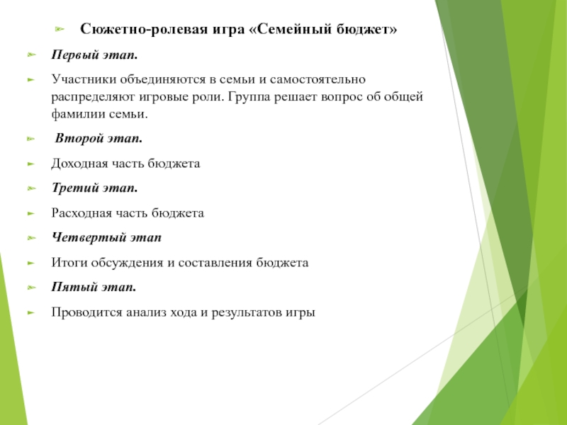 Сюжетно-ролевая игра «Семейный бюджет»Первый этап.Участники объединяются в семьи и самостоятельно распределяют игровые роли. Группа решает вопрос об