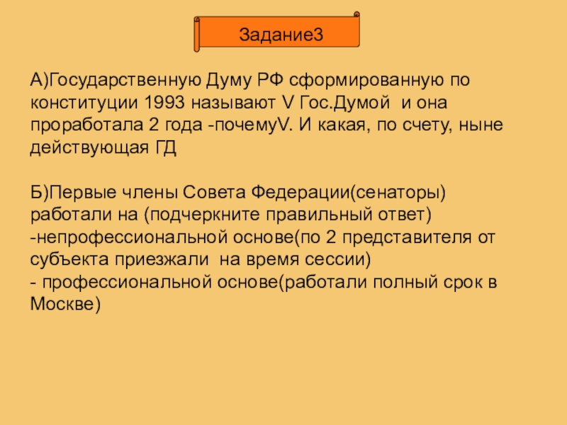 Задание3 А)Государственную Думу РФ сформированную по конституции 1993 называют V Гос.Думой и она проработала 2 года -почемуV.