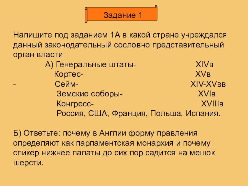 Задание 1Напишите под заданием 1А в какой стране учреждался данный законодательный сословно представительный орган власти