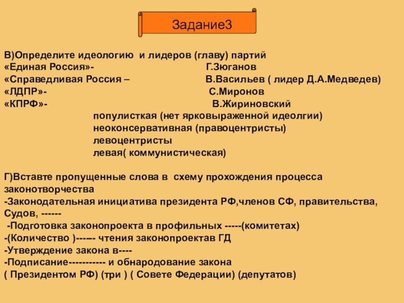 Задание3 В)Определите идеологию и лидеров (главу) партий«Единая Россия»-