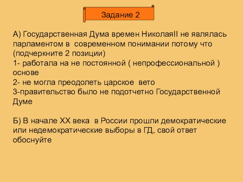 Задание 2А) Государственная Дума времен НиколаяII не являлась парламентом в современном понимании потому что(подчеркните 2 позиции)1- работала