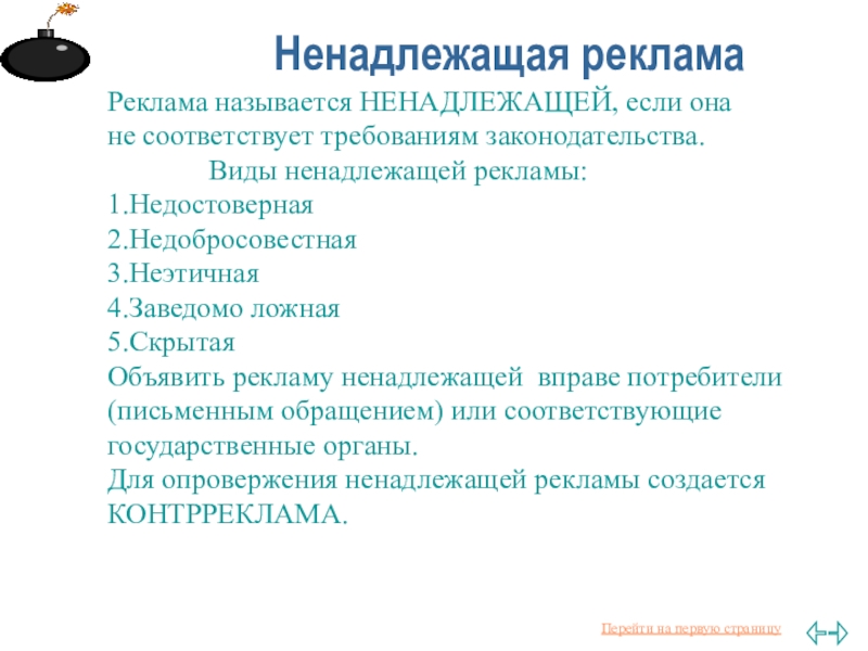 Ненадлежащая рекламаРеклама называется НЕНАДЛЕЖАЩЕЙ, если онане соответствует требованиям законодательства.       Виды ненадлежащей