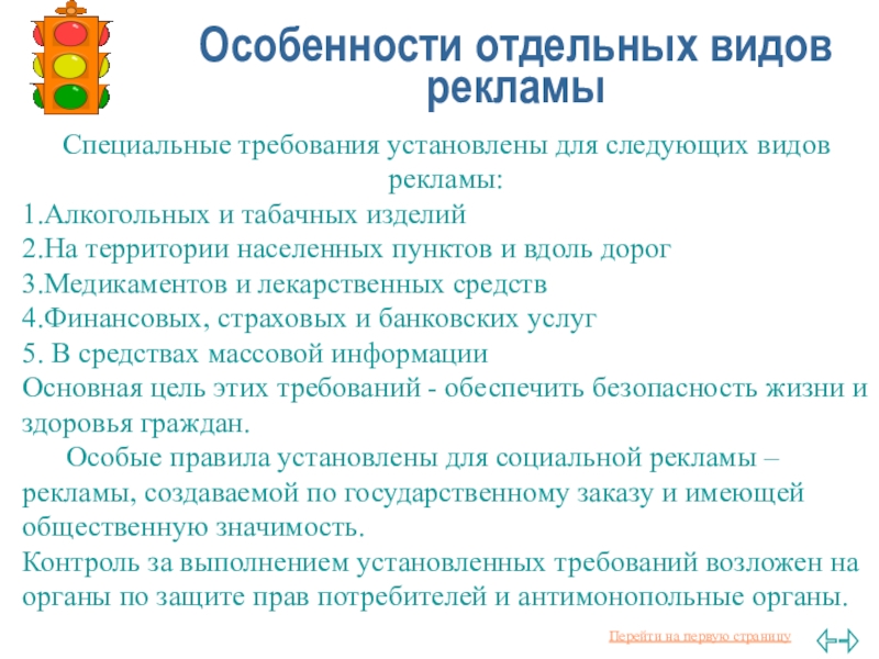 Особенности отдельных видов рекламыСпециальные требования установлены для следующих видов рекламы:1.Алкогольных и табачных изделий2.На территории населенных пунктов и