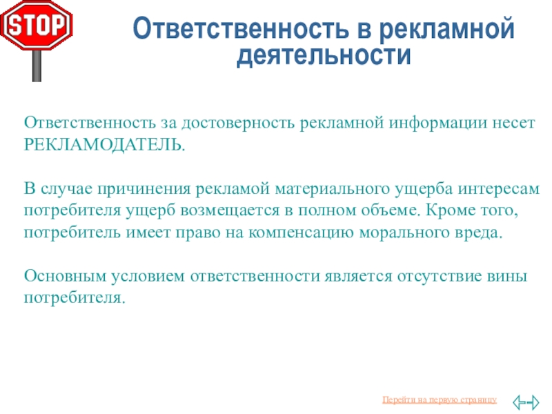 Ответственность в рекламной деятельностиОтветственность за достоверность рекламной информации несет РЕКЛАМОДАТЕЛЬ.В случае причинения рекламой материального ущерба интересам потребителя