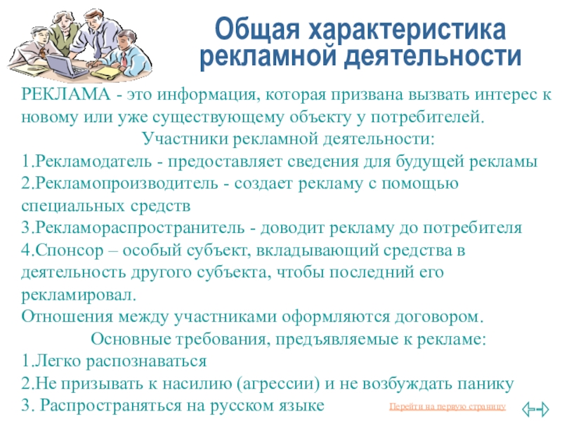 Общая характеристика рекламной деятельностиРЕКЛАМА - это информация, которая призвана вызвать интерес к новому или уже существующему объекту у потребителей.Участники рекламной деятельности:1.Рекламодатель - предоставляет сведения для будущей рекламы2.Рекламопроизводитель - создает рекламу с помощью специальных средств3.Рекламораспространитель - доводит