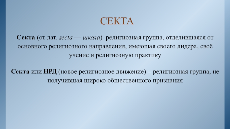 Секта или НРД (новое религиозное движение) – религиозная группа, не получившая широко общественного признания
