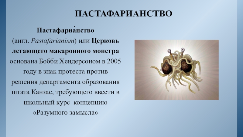 Пастафариа́нство (англ. Pastafarianism) или Церковь летающего макаронного монстра основана Бобби Хендерсоном в
