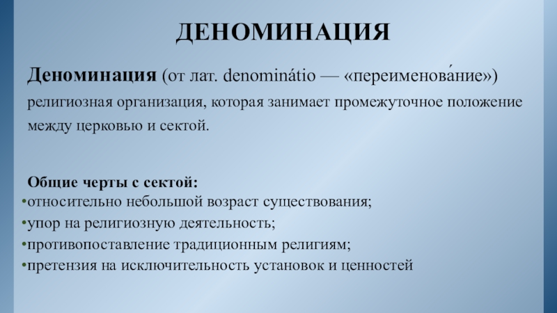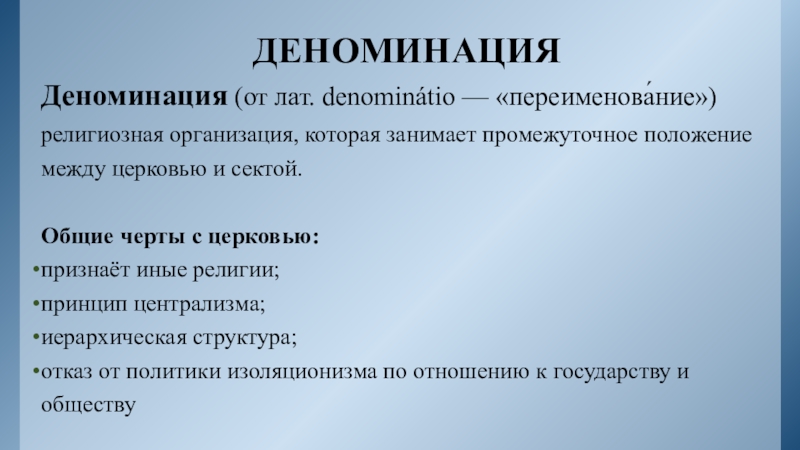 Деноминация (от лат. denominátio — «переименова́ние») религиозная организация, которая занимает промежуточное положение между церковью