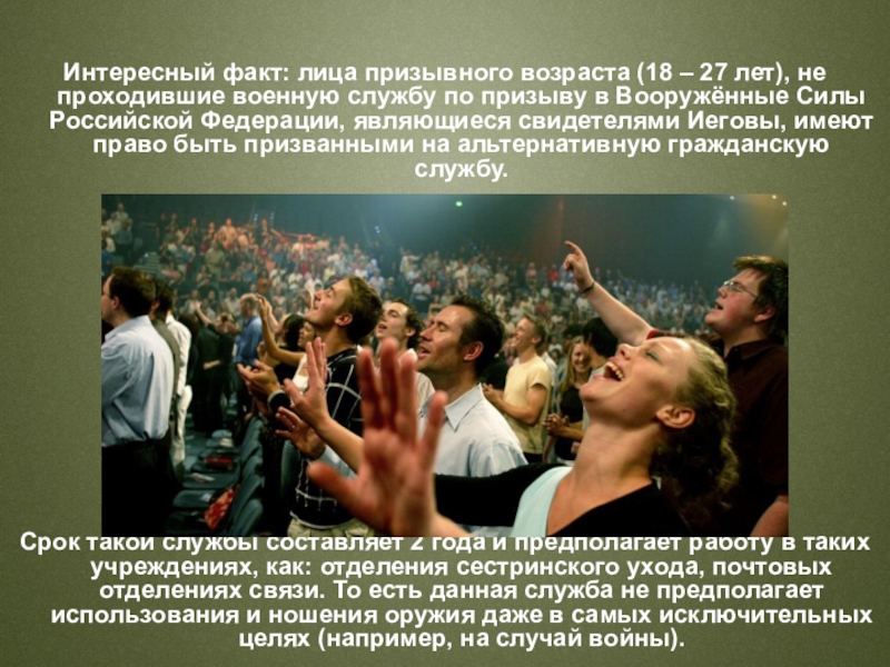 проходившие военную службу по призыву в Вооружённые Силы Российской Федерации, являющиеся свидетелями Иеговы, имеют право быть призванными на альтернативную гражданскую службу.