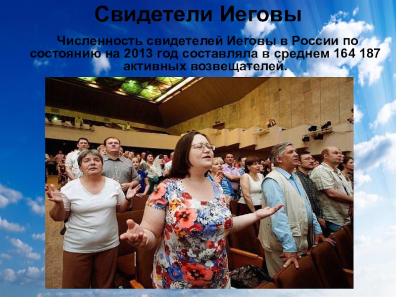 Численность свидетелей Иеговы в России по состоянию на 2013 год составляла в среднем 164 187 активных возвещателей.