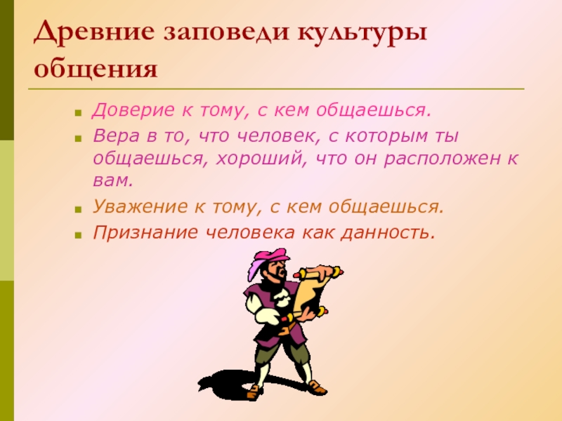 Древние заповеди культуры общения Доверие к тому, с кем общаешься.Вера в то, что человек, с которым ты