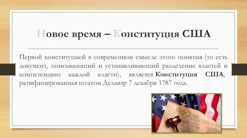 (то есть документ, описывающий и устанавливающий разделение властей и компетенцию каждой власти), является Конституция США, ратифицированная штатом Делавэр 7 декабря 1787 года.