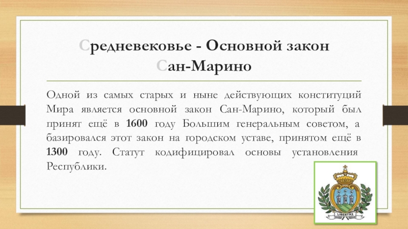 Мира является основной закон Сан-Марино, который был принят ещё в 1600 году Большим генеральным советом, а базировался этот закон на городском уставе, принятом ещё в 1300 году. Статут кодифицировал основы установления Республики.
