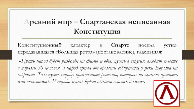 Слайд 4Древний мир – Спартанская неписанная Конституция