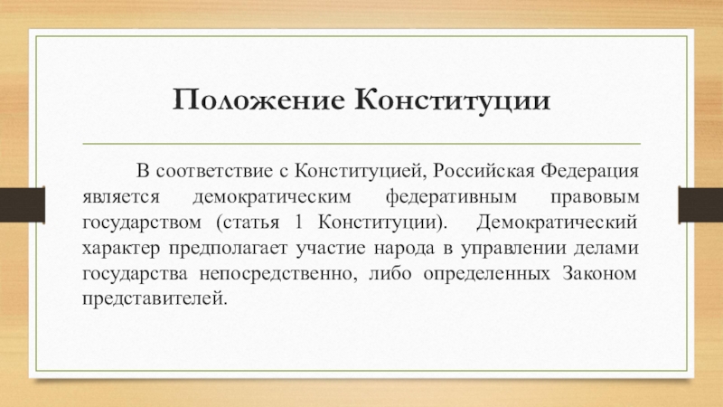 В соответствие с Конституцией, Российская Федерация является демократическим федеративным правовым