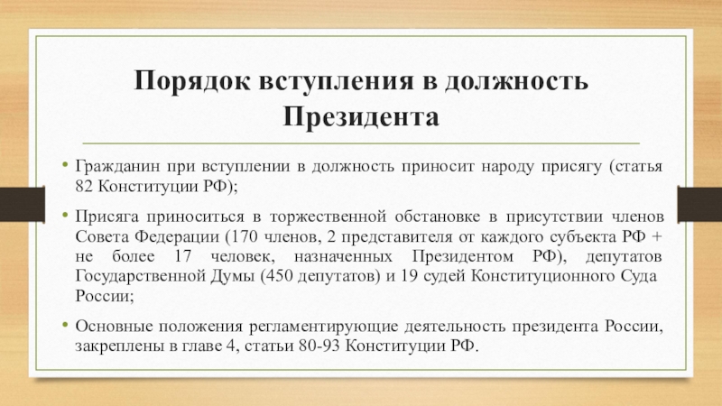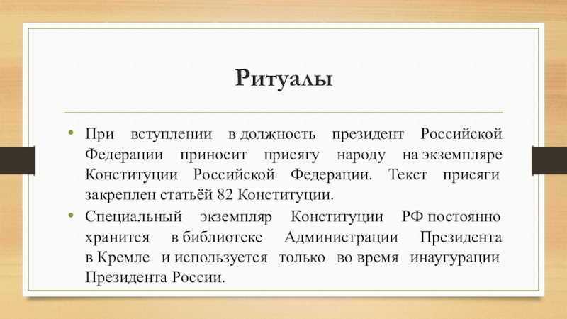 Российской Федерации. Текст присяги закреплен статьёй 82 Конституции.