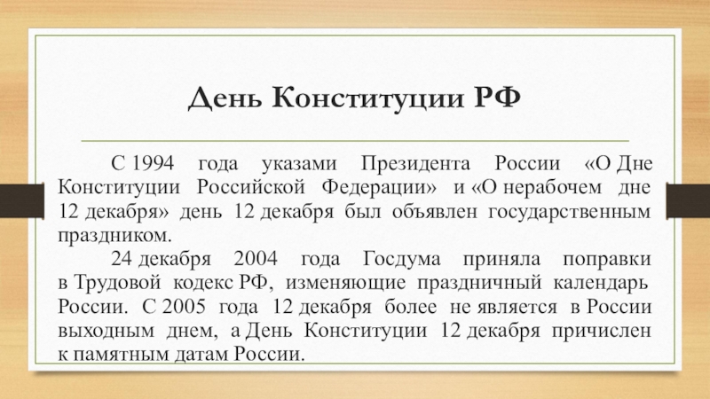 24 декабря 2004 года Госдума приняла поправки в Трудовой кодекс РФ, изменяющие праздничный календарь России. С 2005 года 12 декабря более не является в России выходным днем, а День Конституции 12 декабря причислен к памятным датам России.