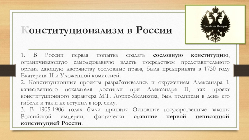 1. В России первая попытка создать сословную конституцию, ограничивающую