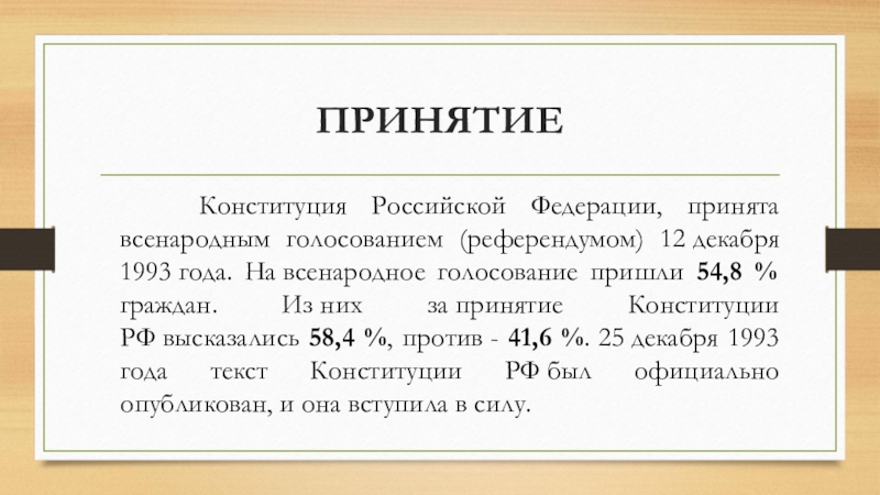 пришли 54,8 % граждан. Из них за принятие Конституции РФ высказались 58,4 %, против - 41,6 %. 25 декабря 1993 года текст Конституции РФ был официально опубликован, и она вступила в силу.