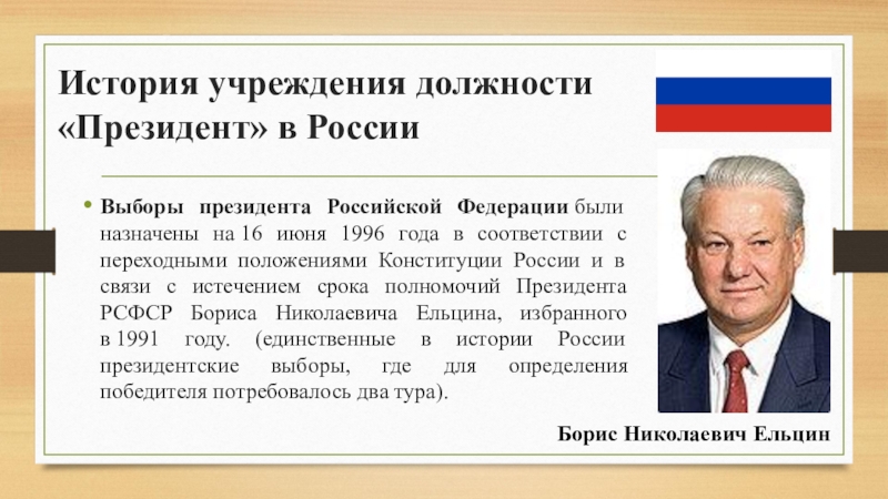 июня 1996 года в соответствии с переходными положениями Конституции России и в связи с истечением срока полномочий Президента РСФСР Бориса Николаевича Ельцина, избранного в 1991 году. (единственные в истории России президентские выборы, где для определения победителя потребовалось два тура).